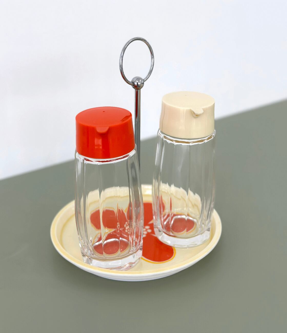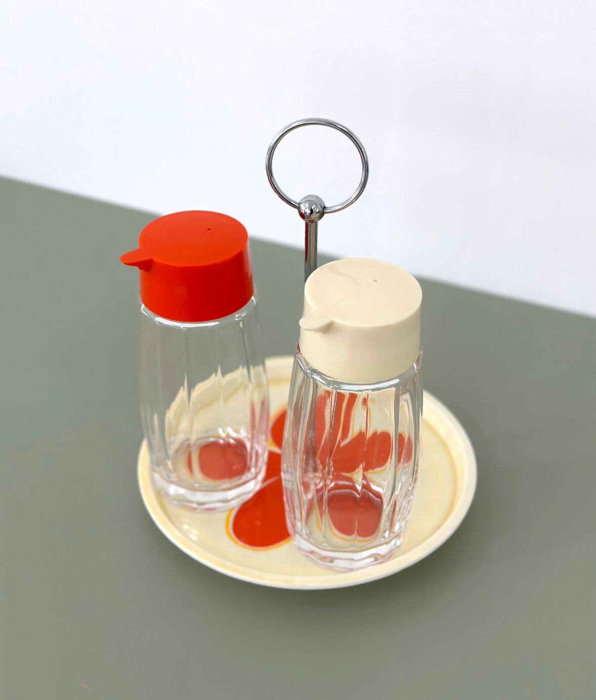 レトロポップ カスターセット しょうゆ差し 花柄プラスチックトレイ ガラスボトル